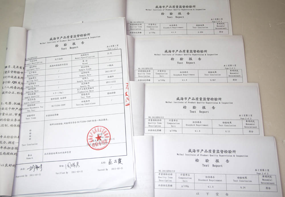 以下為雙舉海參送檢至威海市質(zhì)檢所、威海市農(nóng)副產(chǎn)品檢測中心的檢驗(yàn)報告: