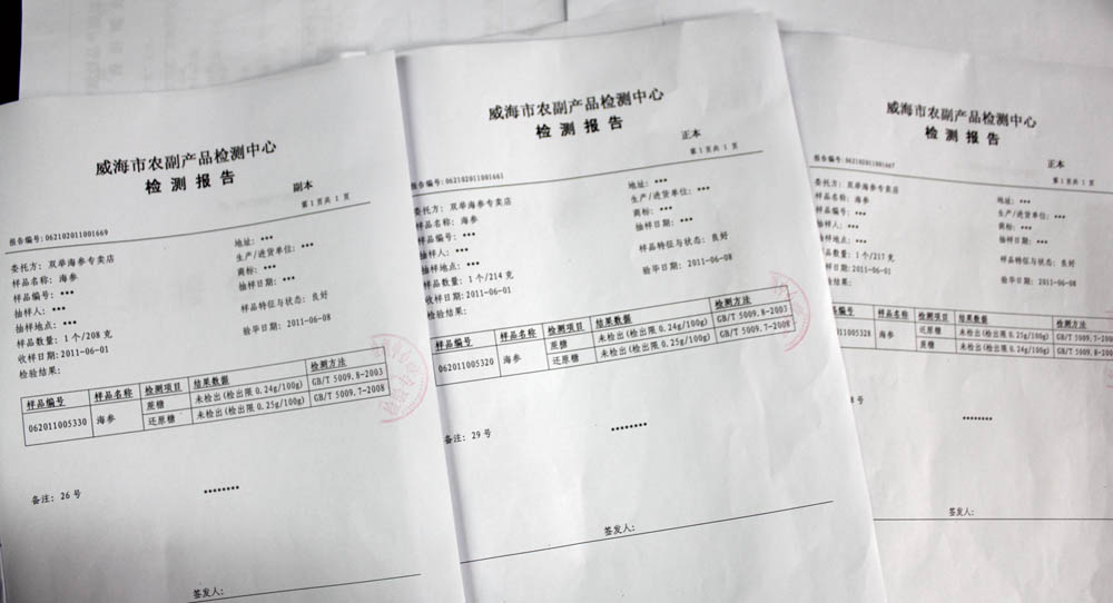 第二道關(guān):經(jīng)進(jìn)貨委員會同意購進(jìn)的海參須把樣品分別送至威海市質(zhì)檢所、威海市農(nóng)副產(chǎn)品檢測中心化驗(yàn),確認(rèn)各指標(biāo)合格(純淡干海參不含糖份),出具化驗(yàn)報告后方可購入,若化驗(yàn)不合格,憑檢驗(yàn)報告退回供貨商;